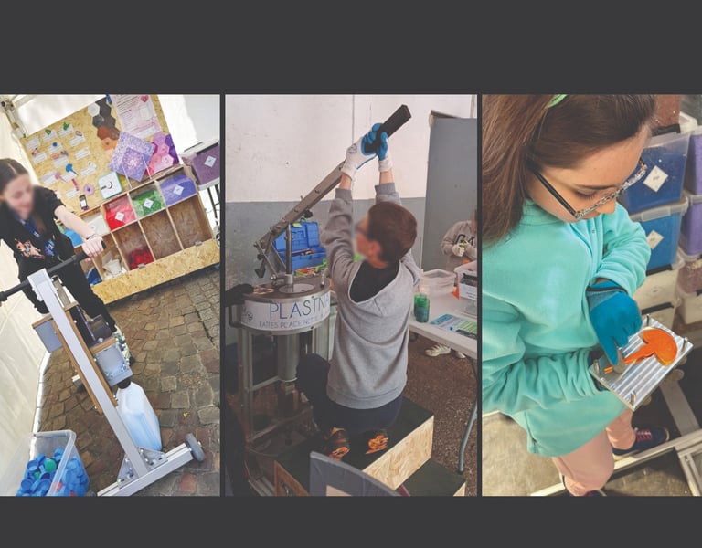 L'animation met en avant le recyclage des déchets plastiques du quotidien pour fabriquer un nouvel objet. Équipements de sécurités présents pour garantir la sécurité de l’utilisateur (gants, écran de protection, balisage…).