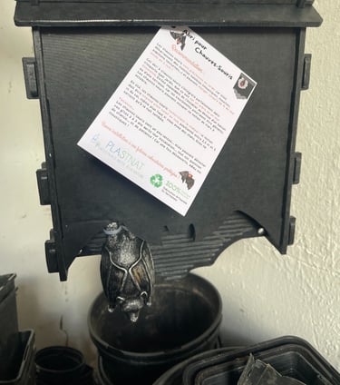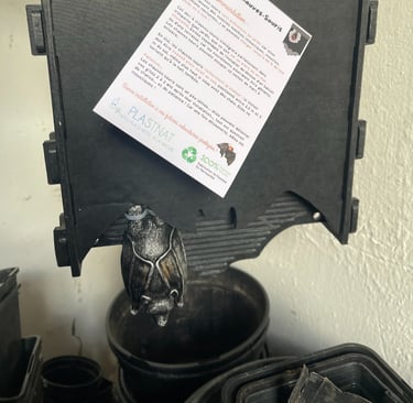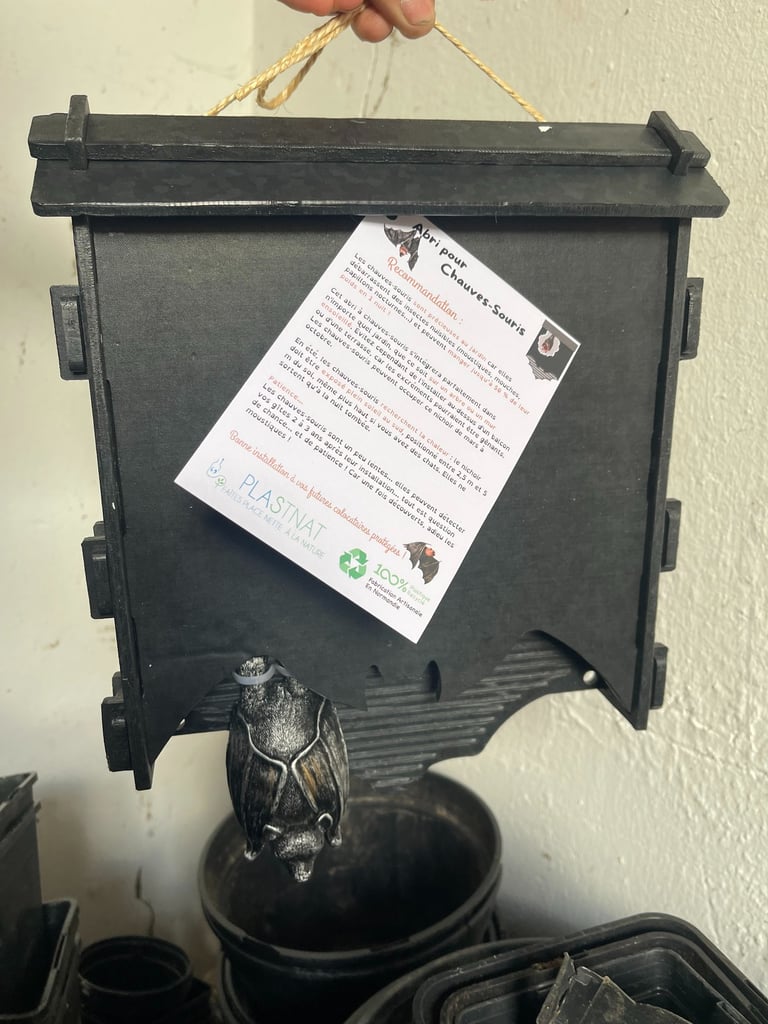 Environ 500 kg de pots de rempotage sont recyclés par PlastNat pour fabriquer des nichoirs à oiseaux et gîtes à chauves-souris en plastique recyclé.